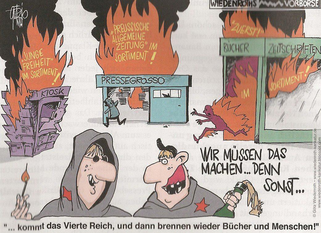 Doch die deutsche Presse jammert, dass das Thema Neonazis an Unis und in anderen Bereichen der Gesellschaft von den Menschen nicht ernstgenommen wird. Weiter hetzt die linksgesteuerte Presse, dass man Neonazis und Menschen mit anderer Meinung als der des Mainstreams generell von jeder Art der Betätigung ausschliessen sollte.